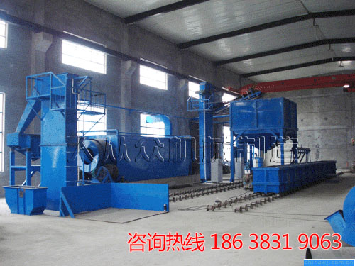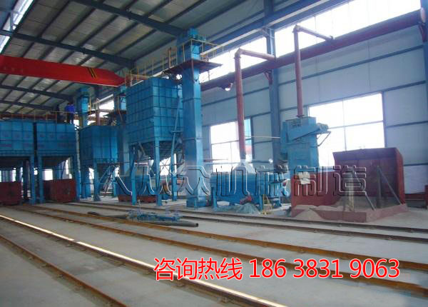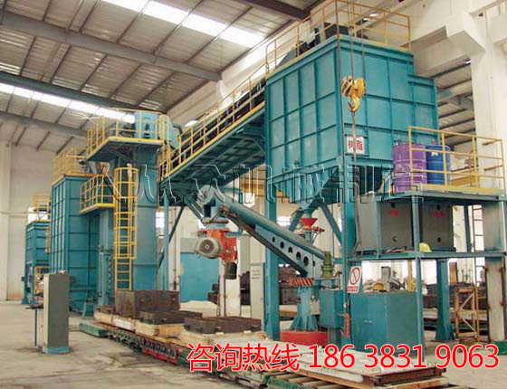 3. 落紗,小車運動至振動落砂機處,自卸至落砂機,篩上物可回爐二次利用,篩下物經研磨落砂至下直線篩,卸車后小車經軌道循環(huán)至模具裝車處;