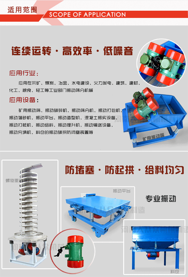 YZS振動(dòng)電機(jī)的激振力利用率高、能耗小、噪音低、壽命長(zhǎng)。振動(dòng)電機(jī)的激振力可以無(wú)級(jí)調(diào)節(jié),使用方便。YZS振動(dòng)電機(jī)作為各類(lèi)振動(dòng)機(jī)械的激振源,可以應(yīng)用于振動(dòng)給料機(jī)、振動(dòng)輸送機(jī)、振動(dòng)放礦機(jī)、振動(dòng)落砂機(jī)、振動(dòng)篩分機(jī)等設(shè)備,YZS振動(dòng)電機(jī)除了可以應(yīng)用與一般振動(dòng)機(jī)械外,還可以組合多種振動(dòng)形式,所以被廣泛的應(yīng)用在水電建設(shè)、火力發(fā)電、建筑、建材、化工、采礦、煤炭、冶金、輕工等領(lǐng)域。