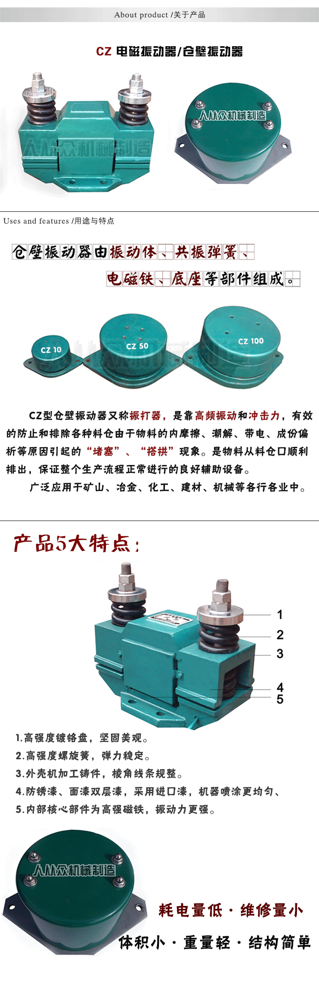 CZ倉壁振動器又稱振打器,是一種特殊的振動電機(jī)。它在工作中能有效避免物料的堵塞、搭拱現(xiàn)象,使物料從料倉口順利排出,是一種保證穩(wěn)定地供料的高效振動電機(jī)。