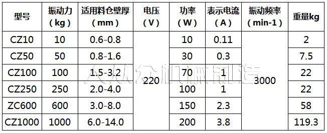 CZ倉壁振動器型號的主要有:CZ10、CZ50、CZ100、CZ250、CZ600、CZ1000等。